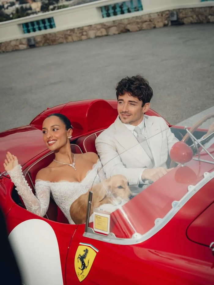 上个月,Leclerc与女友Alexandra Saint Mleux在摩纳哥低调完婚。 Leclerc驾驶一辆价值1200万美元的1957年法拉利250 Testa Rossa经典古董跑车,载着身着蕾丝婚纱的新娘驶离会场。对于一位法拉利车手来说,还有什么比开着法拉利经典车娶走心上人更浪漫的事?